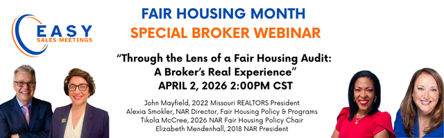As brokers, we carry the responsibility—not just for compliance—but for the culture, conversations, and behaviors happening inside our offices every day. Fair Housing is no longer something we review once a year. It is being evaluated in real time—through how agents communicate, guide clients, and make decisions. Easy Sales Meetings is bringing you a conversation you don’t typically get access to: A real-world Fair Housing audit experience, combined with national policy insight and practical broker guidance. This is not theoretical. This is what is happening now—and what’s coming next. Join Elizabeth Mendenhall, 2018 Past NAR President, and co-partner with John Mayfield at Easy Sales Meetings as we host the "Broker/Manager Only" Webcast with Alexia Smokler, NAR Fair Housing Policy and Programs, and Tikola McCree, 2026 NAR Fair Housing Policy Chair. PLEASE CLICK HERE TO REGISTER